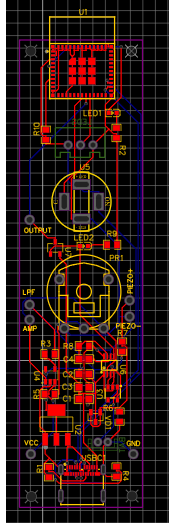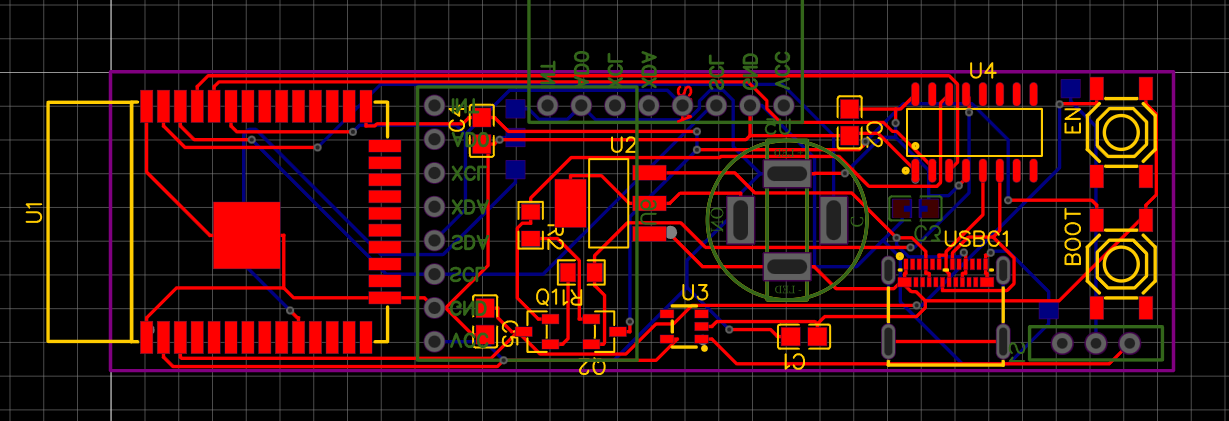 I ended taking the Art and Science of PCB design class to further learn about how to make and design PCBs to better complete this project, and learned enough to begin making simple PCBs, such as breakout boards that I can quickly mill and use. I eventually designed and ordered a handful of prototypes which ended up working, but were decently expensive. Eventually my laptop SSD got corrupted and I lost most of the files related to the project, which was a major hiccup. The current board is designed off of an ESP32 S3 module, and uses a piezo disc for vibration and collision detection. It is able to use control an LED strip, and it runs off of an 18650 cell.