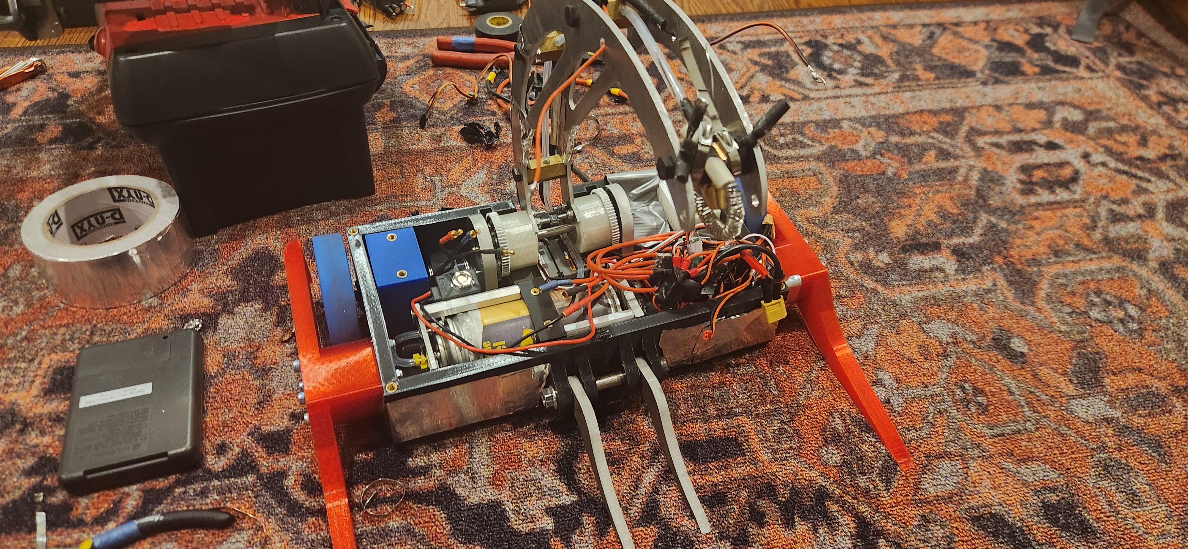 This robot was originally designed to be an overhead flamethrower, but it wasn't particularly effective. I redesigned the robot to be a cam lifter flamethrower later on. The robot uses a butane can and a solenoid valve, as well as a hot surface igniter.