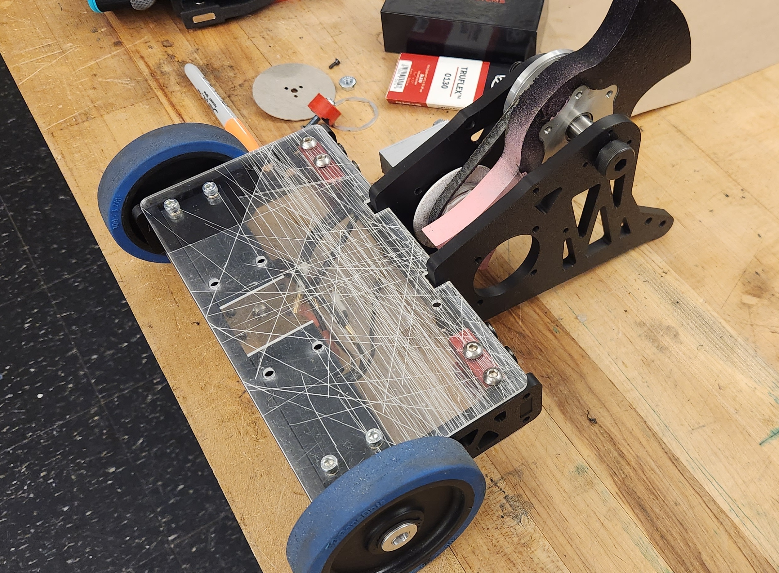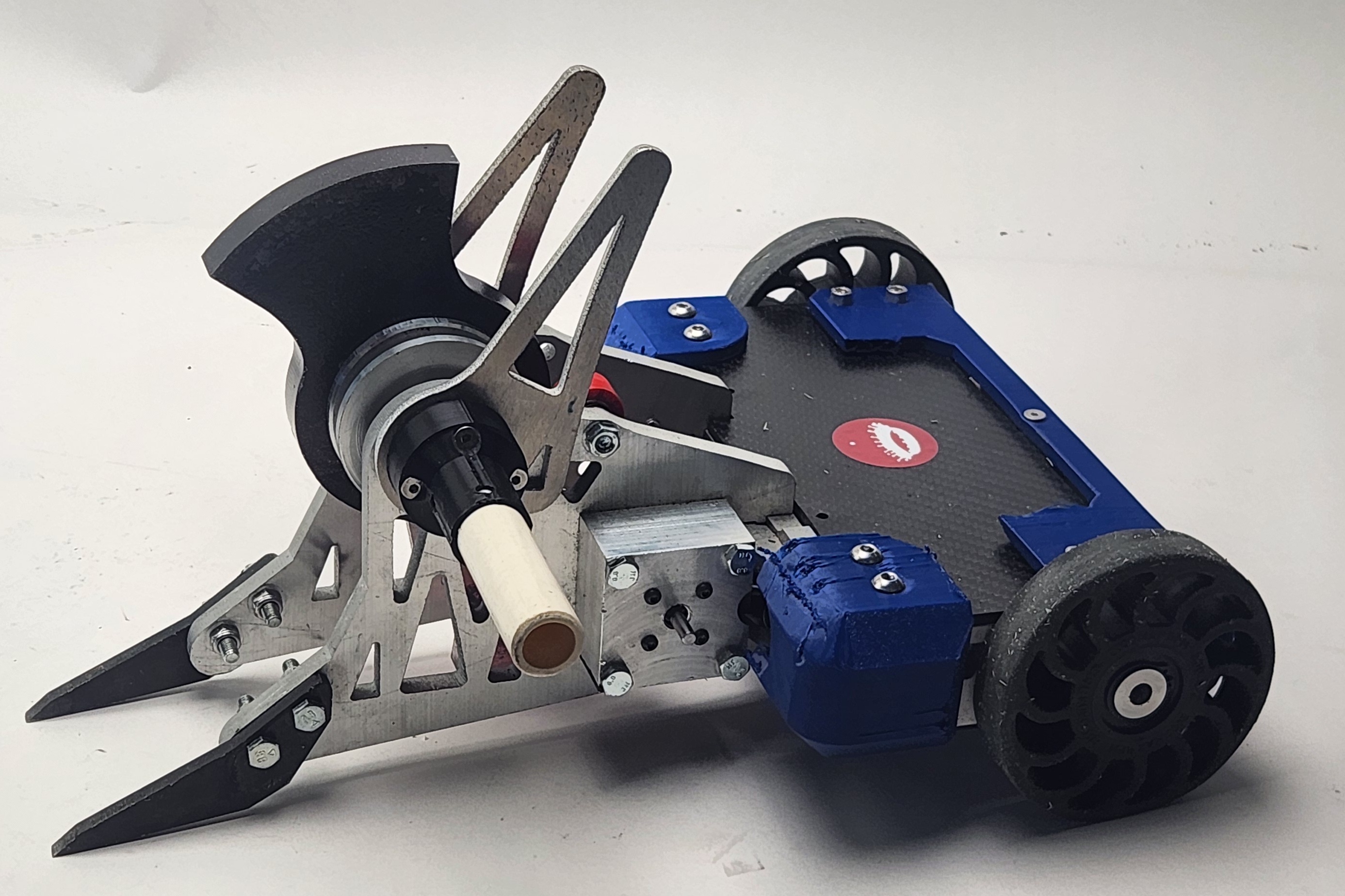 Looking around the club storage room, I found this old combat robot from 2017 originally designed by Alex Hattori. The robot was entirely gutted and only had the frame and weapon stack left over, with no motors or electronics.
